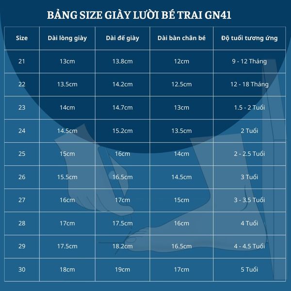 BẢNG SIZE GIÀY LƯỜI BÉ TRAI GN41
