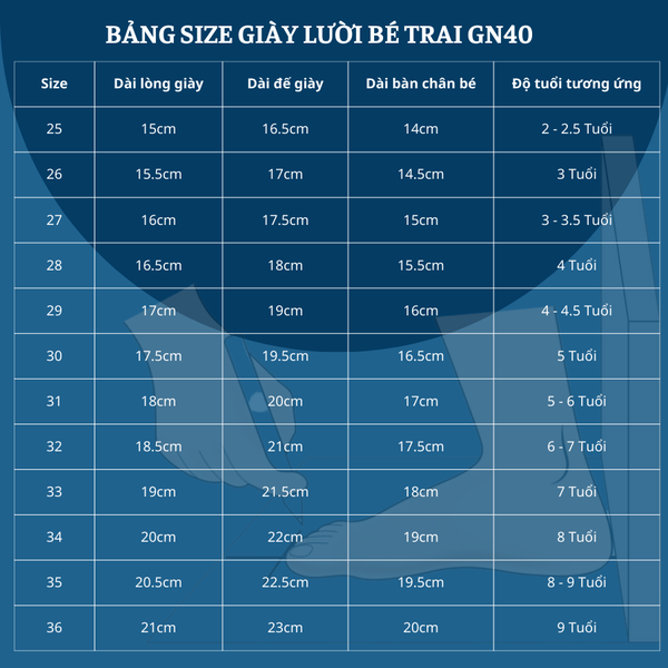 BẢNG SIZE GIÀY LƯỜI BÉ TRAI GN40