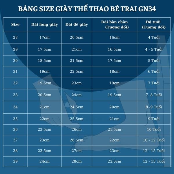 BẢNG SIZE GIÀY THỂ THAO BÉ TRAI GN34