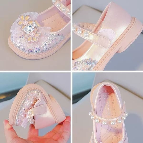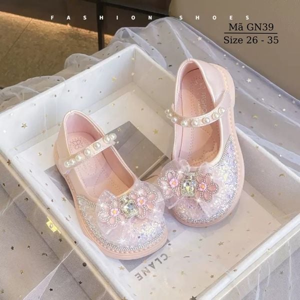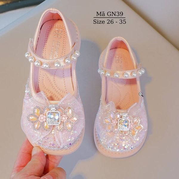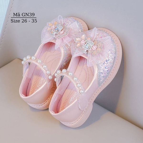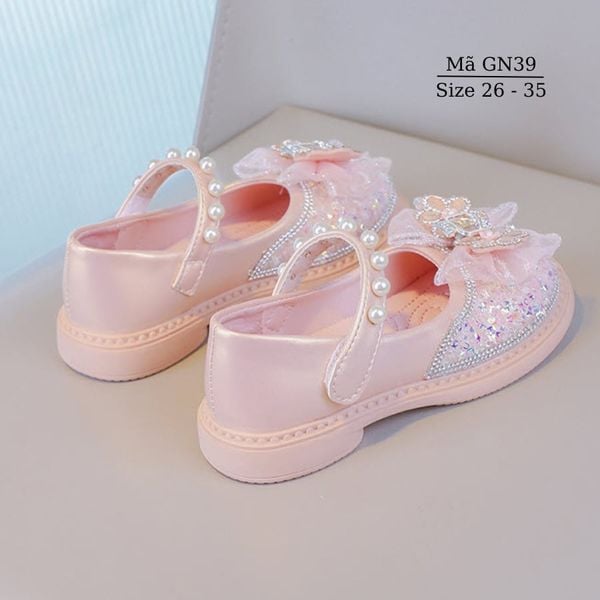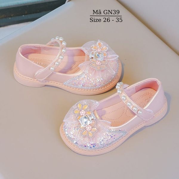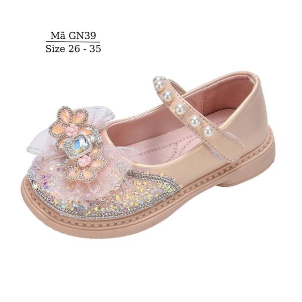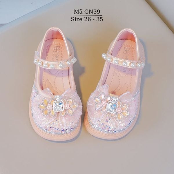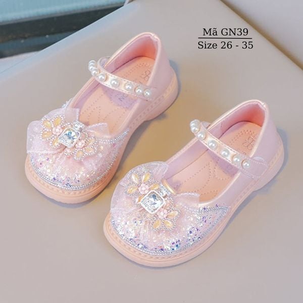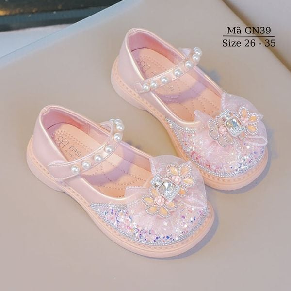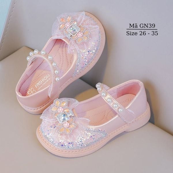 Giày búp bê bé gái GN39 là mẫu giày công chúa hồng cực kỳ được yêu thích bởi thiết kế nơ kim sa lấp lánh, tone hồng cam ngọt ngào và form dáng chuẩn phong cách Hàn Quốc. Chất liệu da PU mềm mại, kết hợp đế su dẻo chống trơn trượt, mang đến cảm giác êm ái và an toàn cho bé khi đi học, đi chơi, chụp ảnh hay dự tiệc.