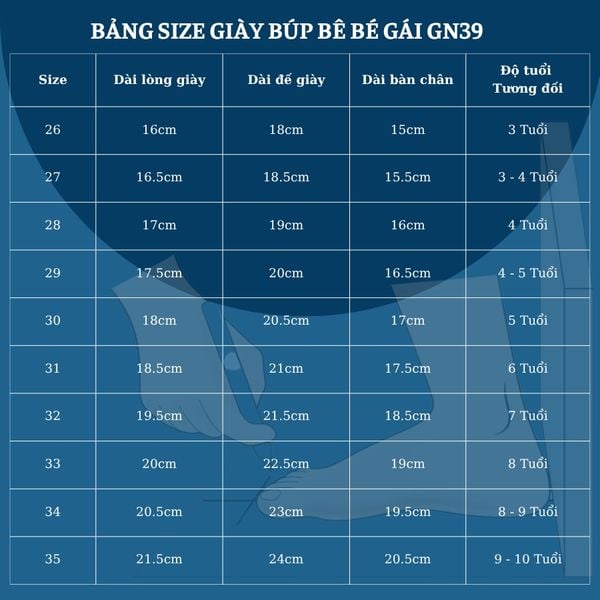 BẢNG SIZE GIÀY BÚP BÊ BÉ GÁI GN39