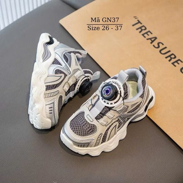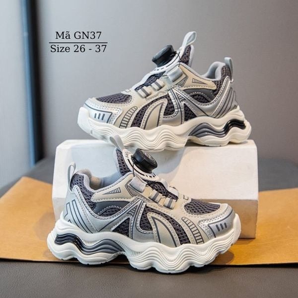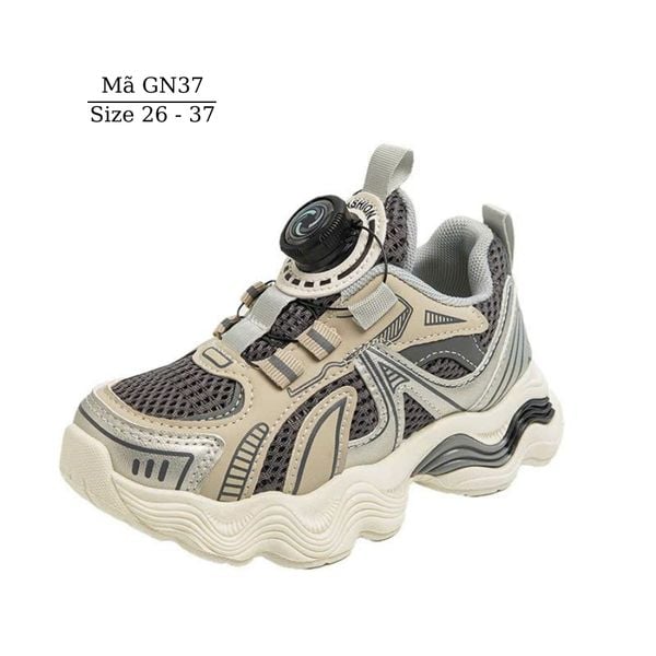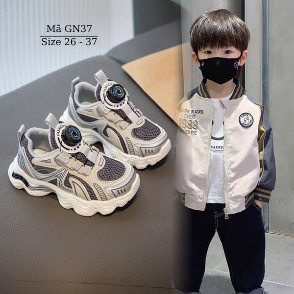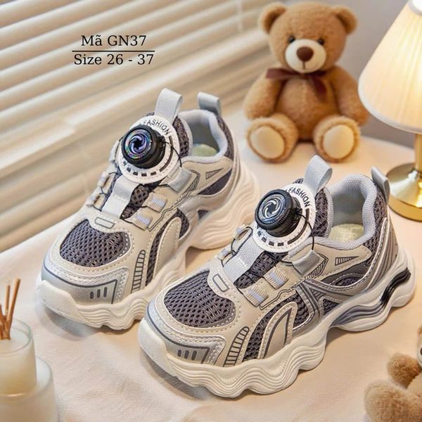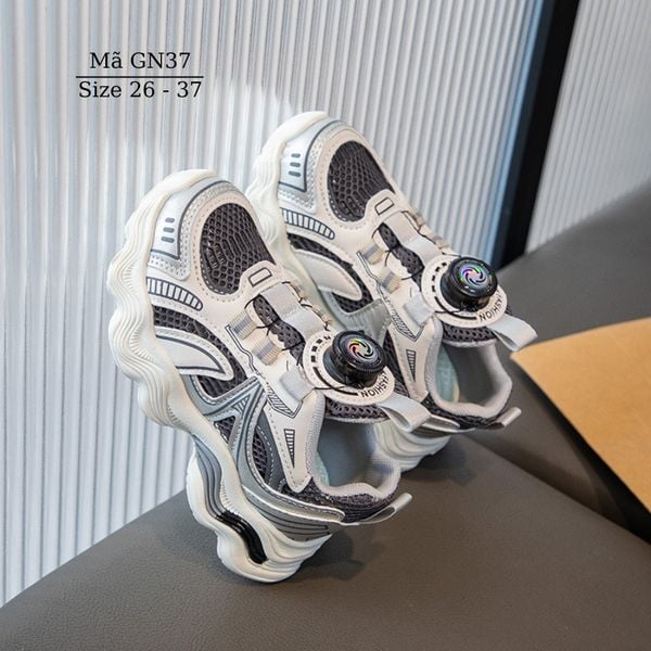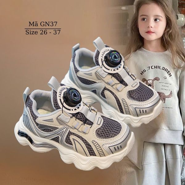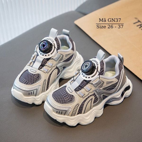 Giày thể thao cho bé trai bé gái khóa xoáy thông minh GN37 chất liệu dù phối lưới mềm êm, thoáng khí. Giày thiết kế với khóa hapu hiện đại không cột dây, không quai dán, chỉ cần nhấc núm lên là mở ra hoặc ấn núm xuống và xoáy để điều chỉnh rộng chật.