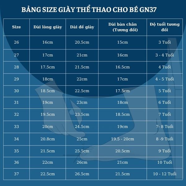 BẢNG SIZE GIÀY THỂ THAO CHO BÉ GN37